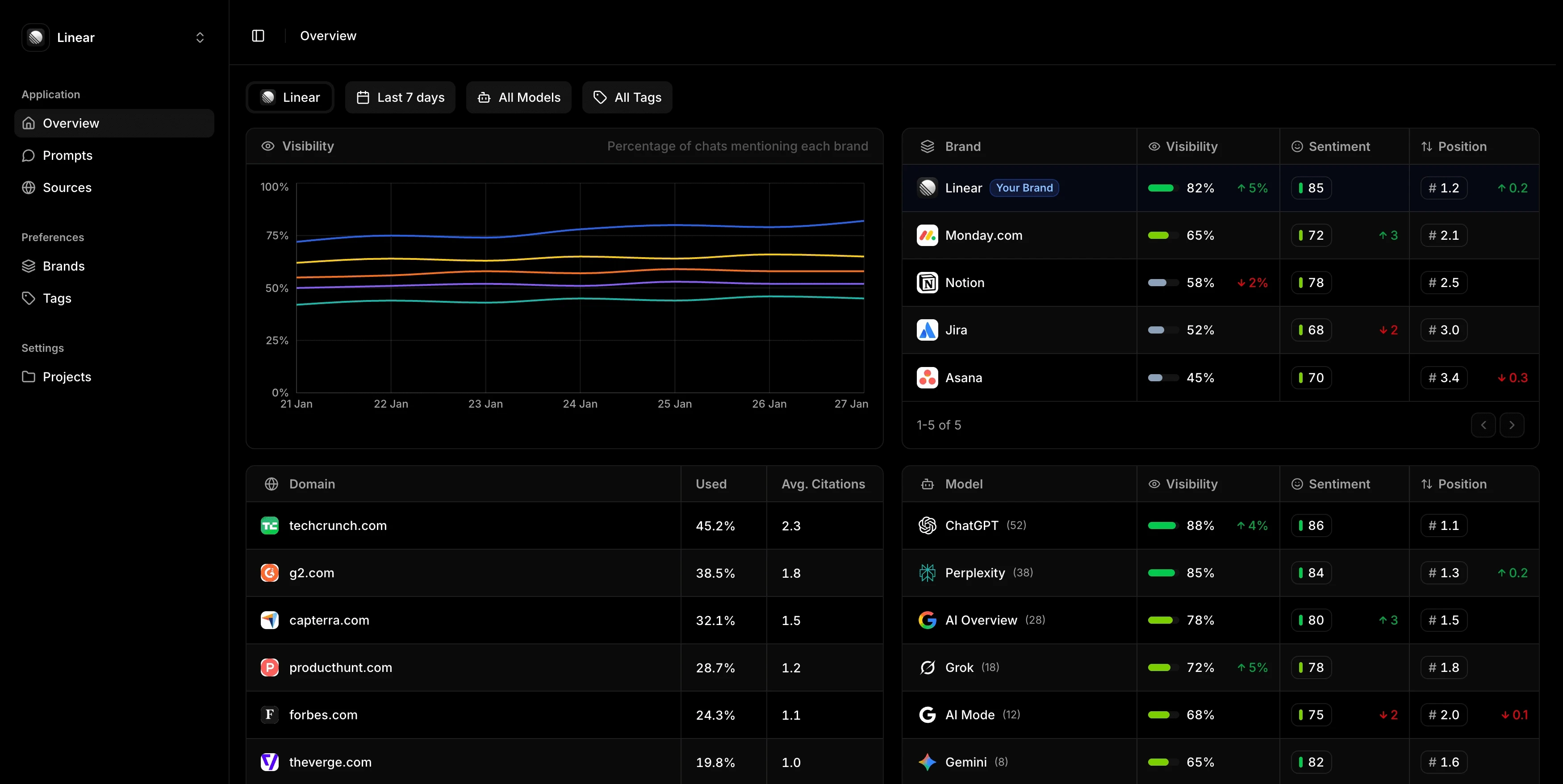 Monitor your visibility on the models that drive the most traffic and discovery.